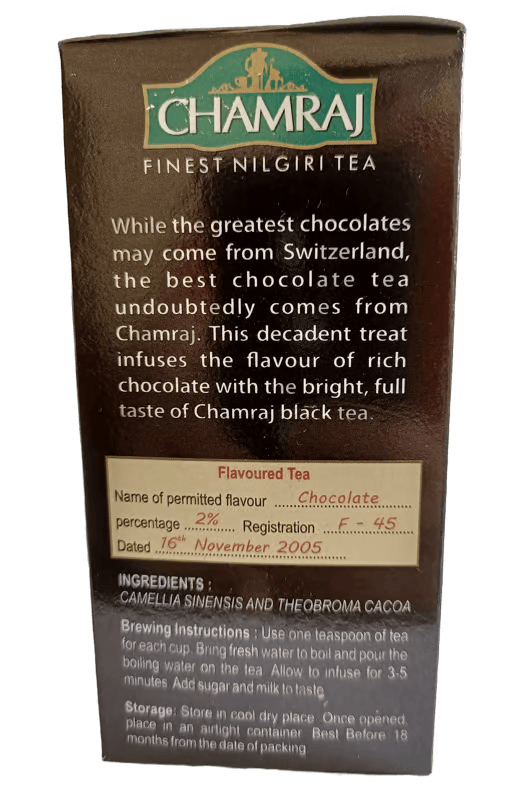 Brewing Instructions: Brew CHAMRAJ Chocolate Tea in freshly boiled water for about 3-5 minutes. The tea can be enjoyed plain or with a touch of milk, which enhances the creamy chocolate flavor. It’s also delicious as an iced tea.