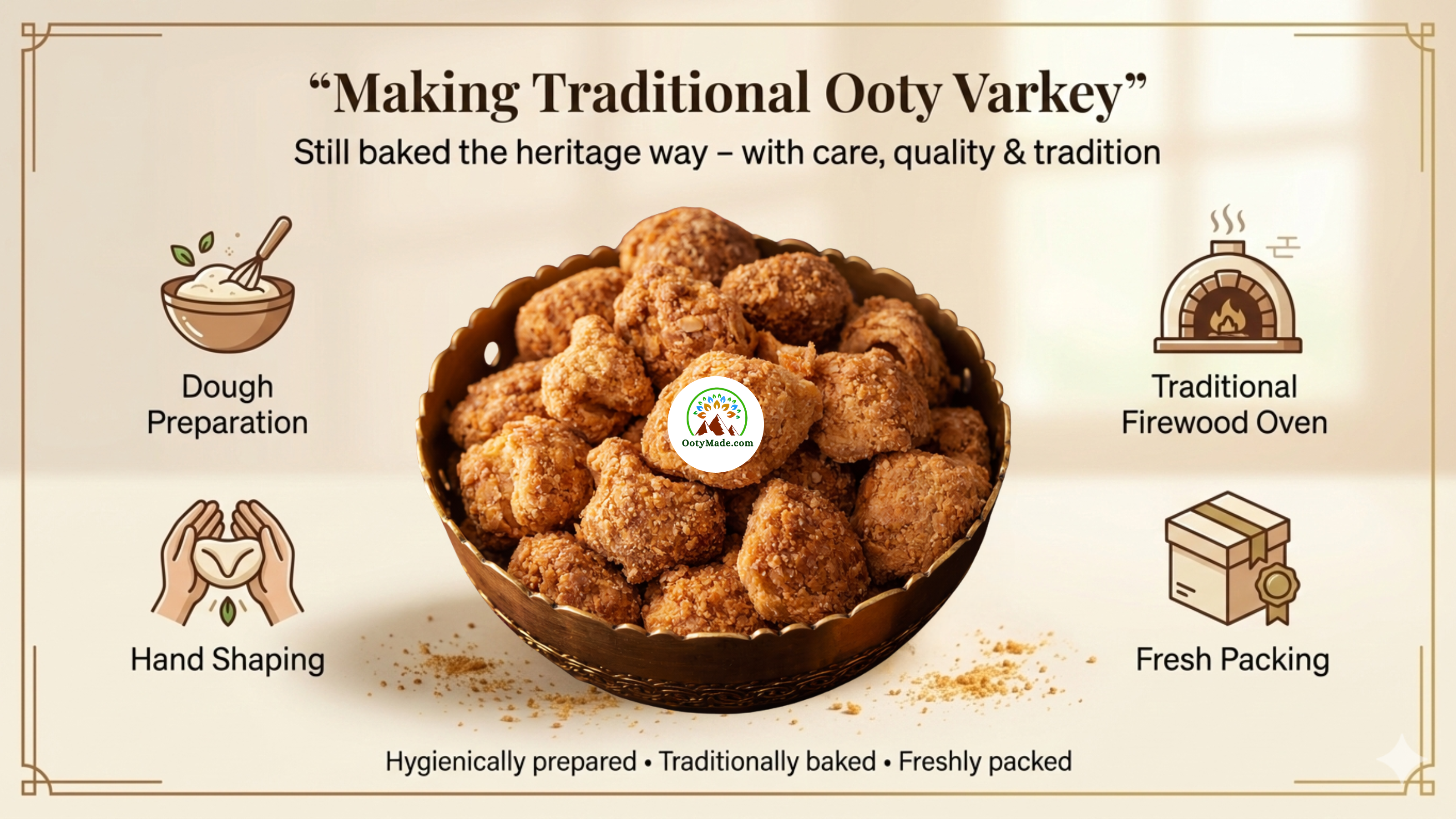 At OotyMade.com, we bring you factory-fresh varkey made using the original method — slow-fermented dough, hand-shaped pieces, and baked in traditional firewood ovens to achieve its signature flaky texture and golden finish.