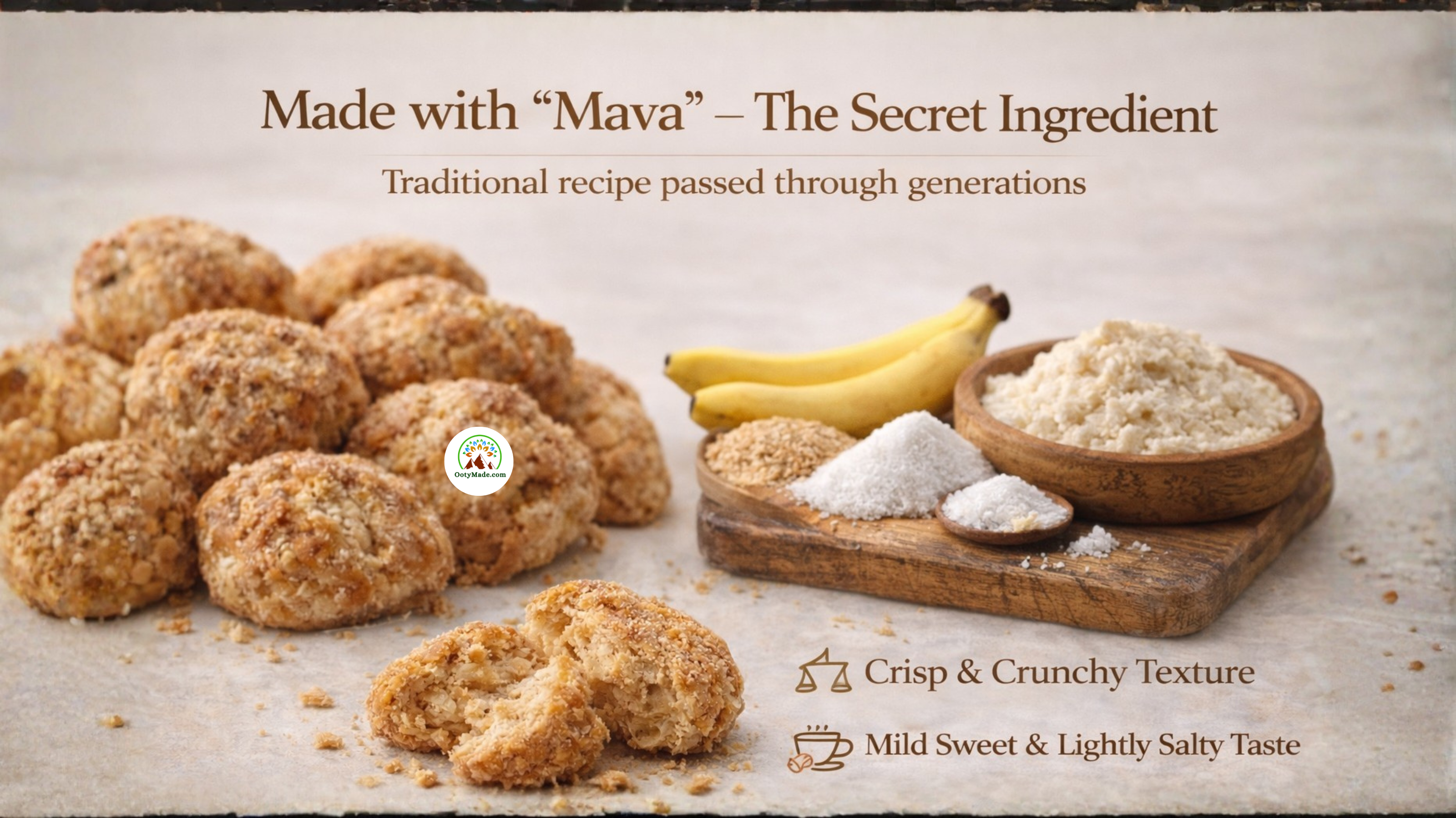 Mava is a unique traditional blend of banana, rawa, sugar, salt, and maida that gives Ooty Varkey its signature taste.